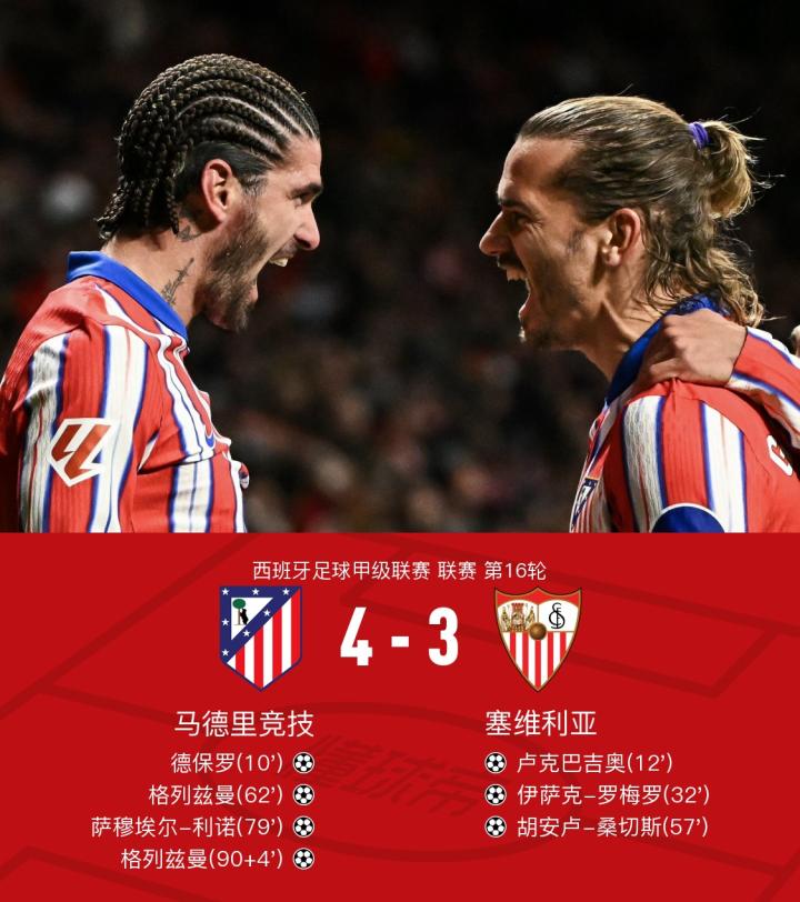 马德里竞技4-3绝杀塞维利亚,豪取9连胜